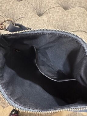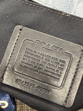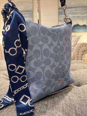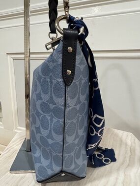 Coach hobo bag in a blue signature monogram print. Silver-tone hardware. Includes a navy patterned scarf tied to the handle. Sleek zip-top silhouette. Stylish everyday carry.