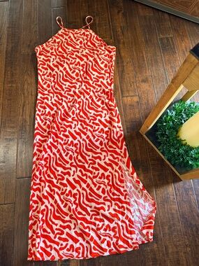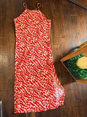 Lightweight red patterned slip maxi dress with thin straps for easy wear. Sleek, drapey silhouette flatters the figure. Vibrant red print adds a bold, stylish statement to outfits. Ideal for daytime events or layered evening looks.
