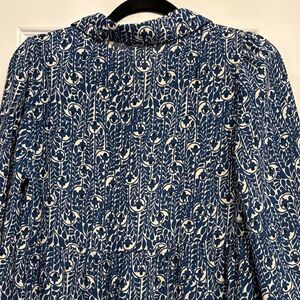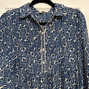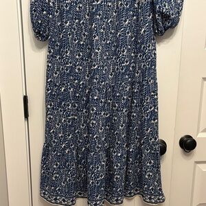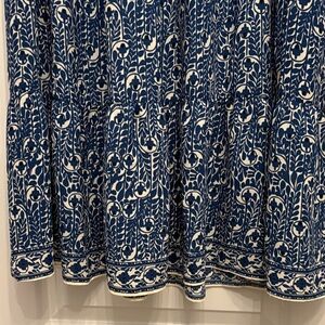 Flowy maxi dress with 3/4 sleeves in a gorgeous blue and white print. V-neck with collar, buttons and detailed trim. Relaxed silhouette and tiered hem, this dress checks all the boxes: comfy, cute, dressy or casual, perfect for work or a Sunday brunch, Lightweight and breezy for everyday wear. Tags removed but never worn.
