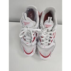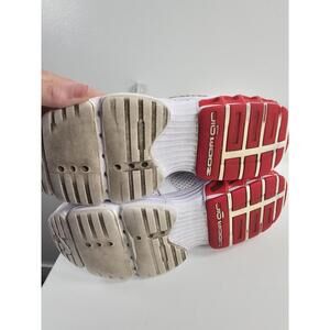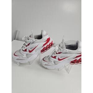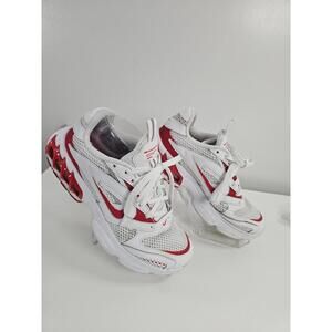 Comfortable and stylish Nike Zoom Air sneakers in white with red accents. These shoes feature breathable mesh and durable synthetic overlays, perfect for everyday wear or light sports activities. The Zoom Air cushioning provides excellent support and responsiveness. Well-maintained with minor signs of use, ready to step up your shoe game!