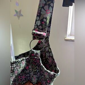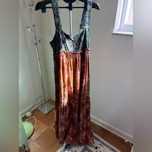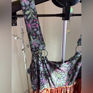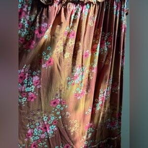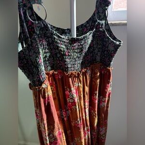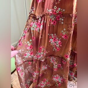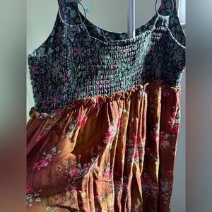 Flowy tiered maxi dress with mixed floral prints. Green floral bodice and rust brown floral skirt. Lightweight and breezy. Perfect for casual summer days.