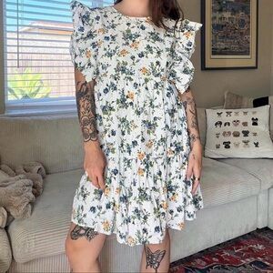 Lightweight tiered mini dress with flutter sleeves. White base with scattered blue and yellow floral print. Relaxed, feminine silhouette. Easy to style for daytime wear.