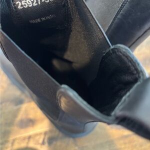 Sleek black leather Chelsea ankle boots. Chunky lug sole for bold traction. Elastic side panels for easy slip-on wear. Gold Cavalli Class logo accent at heel. Stylish and versatile for day or night.