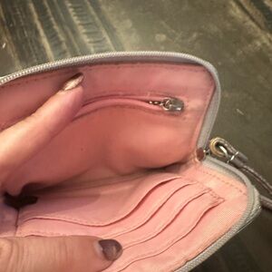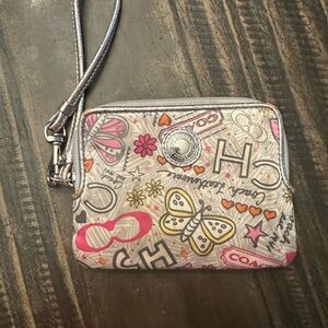Charming Coach wristlet with lively graphics. Features pink, orange, and gray accents. Perfect for small essentials. Signs of wear. Fair/good condition