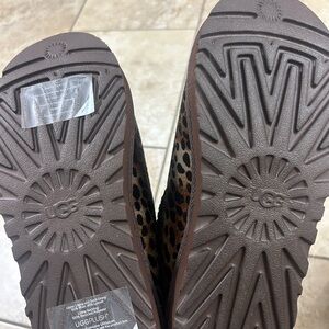 UGG slip-on clogs with leopard-print upper. Plush interior lining for cozy wear. Easy to slide on with cushioned sole for comfort. Stylish animal pattern pairs with casual outfits. Originally $155