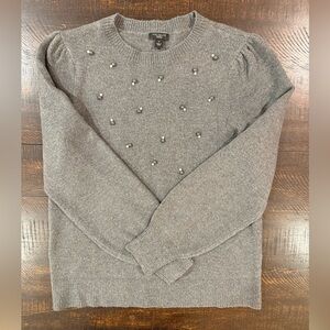 Beautiful Ann Taylor Factory petite sweater in a soft heather gray knit featuring scattered pearl and rhinestone embellishments. Classic, feminine piece with subtle sparkle—perfect for work, casual, or holiday layering.