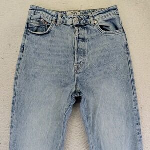 Keywords: denim, light wash, vintage wash, button fly, high rise, straight leg, distressed, casual, streetwear, everyday, basic, staple, trendy