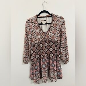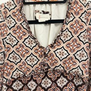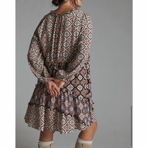 Size XS Anthropologie mixed print boho mini dress in beautiful earthy tones. Features a flattering V-neckline with subtle ruffle trim, long sleeves with elastic cuffs, and a tiered ruffle hem. The contrasting geometric and medallion prints give it that effortless, free-spirited Anthropologie vibe.