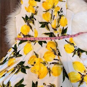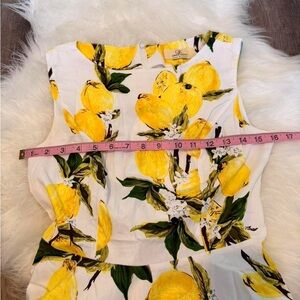 Sleeveless fit-and-flare midi with bright lemon motif. Fitted bodice and flared skirt for a flattering silhouette. Vibrant yellow lemons with green leaves on a white base. Playful and fresh for daytime events.