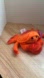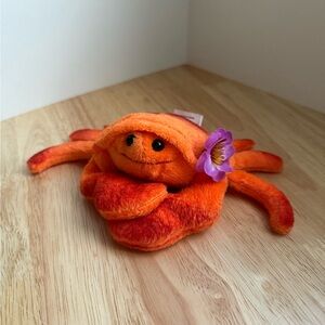Soft orange plush crab with vibrant red-orange accents, cute embroidered smile, and purple fabric flower for added charm. Perfect cuddle buddy and imaginative play companion.