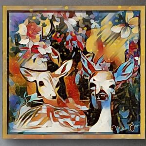 Add a touch of ethereal charm to your home with this vibrant, multi-colored art piece. Featuring two fawns nestled among blooming flowers and butterflies, this piece uses a unique "prismatic" style that mimics stained glass and Impressionist brushwork.