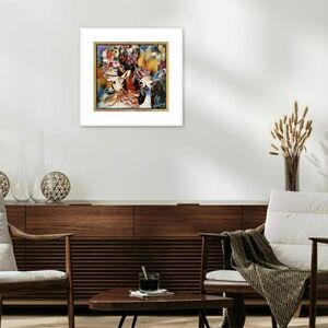 The warm gold, deep crimson, and soft white tones make this a versatile statement piece for a nursery, gallery wall, or modern living space.