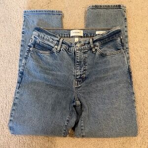Keywords: FRAME jeans, straight leg, high rise, acid wash, denim, designer jeans, casual wear, everyday denim, classic fit, vintage wash, distressed denim, premium denim