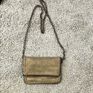 Bronze Faux leather flap shoulder or crossbody bag. Bag has silver chain & embroidered w/silver chain @ bottom. Great condition