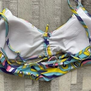 Beautiful! Three piece Swimwear. Bottoms are boy like shorts w/elastic ruche. Top has drawstring @ bottom, padded bra & adjustable straps. Matching cover-up.