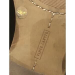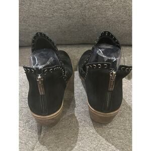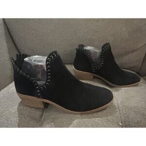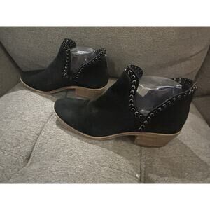 The Vince Camuto Black Suede Booties in size 9M are stylish ankle boots perfect for parties, cocktails, or casual occasions. Made of black suede with a slip-on closure, these booties feature a block heel and a rubber outsole for comfort and stability. With a solid pattern and a regular calf width, these booties are a trendy addition to any woman's wardrobe, adding a touch of sophistication to any outfit.