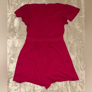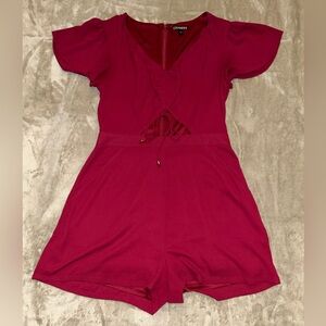 Express hot pink one-piece romper with flutter sleeves and waist tie. Lightweight and comfortable fabric for easy wear. Stylish v-neck with front tie detail for a playful look. Perfect for everyday play and casual outings.