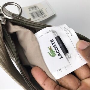- zipper closure with Lacoste circular zipper pull, silver tone hardware