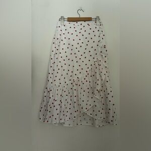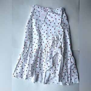 New with tags Savida skirt in a crisp white base with allover strawberry print. Features an elegant asymmetrical wrap silhouette, soft cascading ruffle trim, and a flattering front slit that adds movement and shape. Lightweight and airy with a romantic, summer-ready feel—perfect styled with a cropped tank, linen blouse, or simple knit.