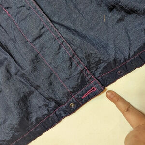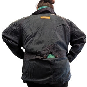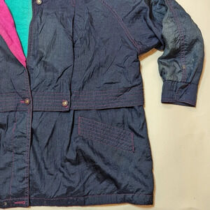 Vintage 80s Nuage Multicolour Navy Yellow Pink Wind Breaker Woman 44 Gaaaah! The 80s called, they want this jacket back because it is such a vibe ! Multilayer closure, hot pink / green/ navy lightweight outdoor fabric, 80s colours, Air flow back. Preloved and vintage - SEE PHOTOS. Slight sun discolouration on left arm/shoulder, small stain on left arm, buttons missing (there are several through the jacket you could take to replace front button), tag is losing part of its stitching, lining needs to be stitched. Outside of that sooo much life left ! Model 5'8" - usually wears 2XL / 3XL - this is roomy at a size 44. Make me an offer or bundle to save 🩷