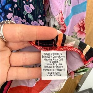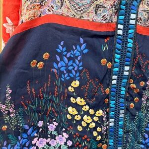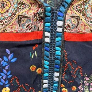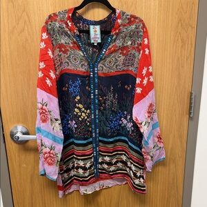 Johnny Was multicolor floral patchwork tunic in navy, red, and pink. Lightweight, relaxed silhouette with mixed floral and paisley panels for a bohemian look. Embroidered trim and vibrant striped hem add eye-catching contrast. Pairs well with jeans or leggings for effortless, stylish layering.