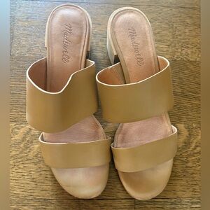 Madewell tan slide sandals with wide straps for secure, comfortable wear. Smooth leather upper and cushioned footbed for all-day comfort. Versatile tan color matches casual and dressy outfits.