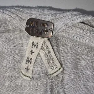 Free People this We The Free light gray ribbed sweater features a soft funnel/cowl neckline, longline tunic length, raw hems. The back has a stylish cut-split open-back detail.