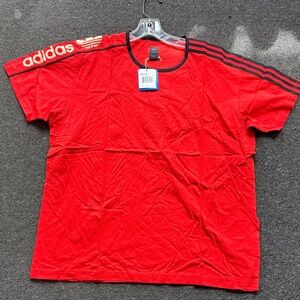 Bold red adidas tee with white ringer trim. Signature three white stripes on shoulders. Centered "EUROPA" graphic with trefoil accents. Slim casual silhouette ideal for sporty looks.