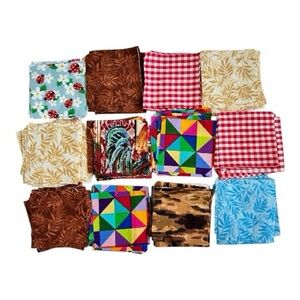 Bundle of assorted cotton fabric squares in bright prints. Includes multicolor geometric, red gingham, brown leaf, beige leaf, blue leaf, ladybug floral, batik and rooster motifs. Great for quilting, crafts, and sewing projects. Vibrant mix of patterns and colors.
