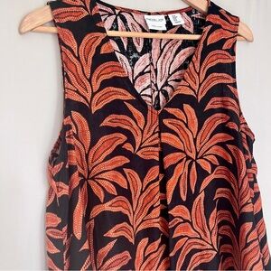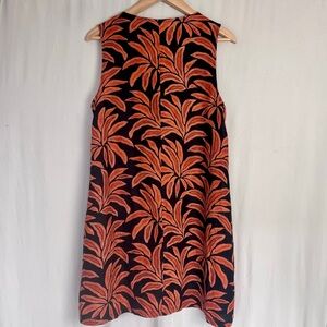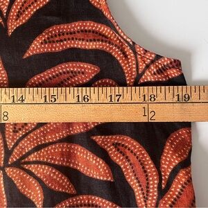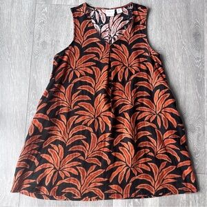 Effortlessly chic Rachel Zoe sleeveless linen dress featuring a bold palm-inspired print in warm rust and black tones. Designed in a flattering A-line silhouette with a relaxed fit and hidden side pockets for everyday ease.