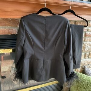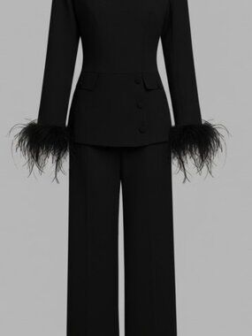Women's Black Buckle Feather-trimmed Crew Neck Long Sleeve Dressy Top with Pants