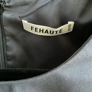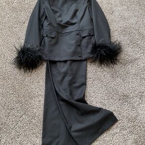 Beautiful Fehaute pant suit for wedding, business or cocktail wear. Rayon 20%, polyester 80%, lining polyester 100%. Worn once to a wedding and cleaned. Inseam is 27 inches.