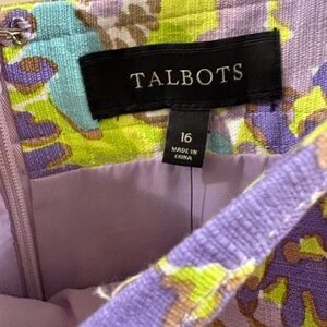 Bold floral print skirt from Talbots. Purple, lime and aqua colorway. Lightweight woven fabric with lining and with a smooth drape. Fresh, eye-catching pattern for warm-weather outfits. Like new. Size 16. Machine wash.