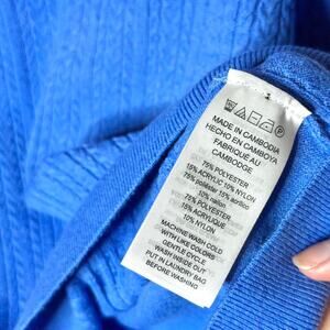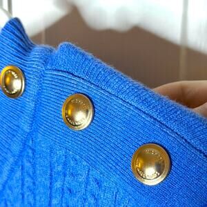 Stunning cobalt blue cable knit sweater from Michael Kors. This piece features a chic crew neck and iconic gold-tone logo-engraved buttons along the left shoulder for a polished, designer touch. The texture is a beautiful mix of vertical cable stitching on the front and sleeves with a smooth knit back.
