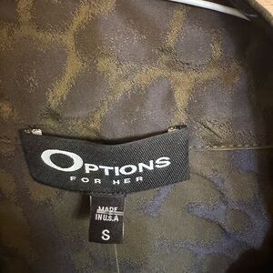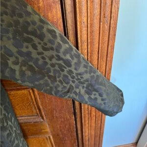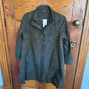 Unique Options for her jacket/coat in olive leopard print. Lightweight, tailored silhouette with a refined collar and three-quarter sleeves. Subtle textured pattern adds versatile style for day or evening. Made to layer over work or casual outfits.