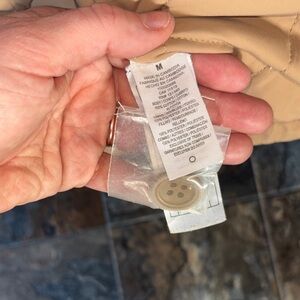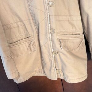 Tan utility jacket with fur-trimmed hood. Features button closure and front pockets.