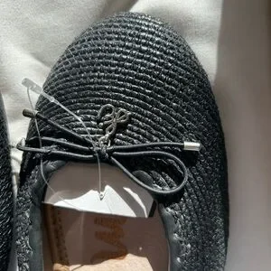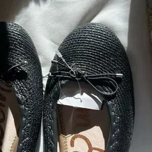 Classic black quilted ballet flats by Sam Edelman. Rounded toe with a small decorative bow. Soft cushioned insole for everyday comfort. Versatile, chic design suitable for work or casual wear.