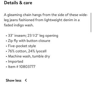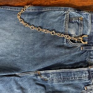 High-rise fit with a wide leg silhouette and a sassy little gold-tone chain on the right hip ✨