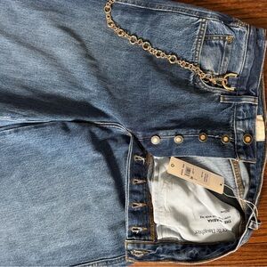 Medium blue “Dillion” wash denim with subtle fading and a wide hem give them a classic 90’s look. The denim is sturdy but really nice and soft.