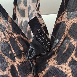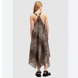 Flowing asymmetrical maxi dress in beige leopard print. V-neckline with relaxed sleeveless straps. Lightweight drape creates soft movement. Casual chic for daytime or evening wear.