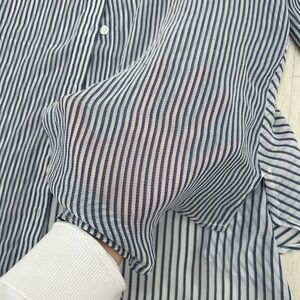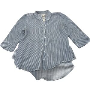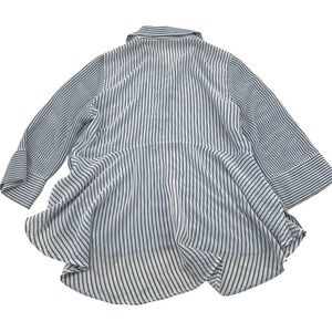 Keywords: Chico's shirt, striped blouse, sheer top, lightweight, button up, high low hem, 3/4 sleeve, casual wear, beach cover up, resort wear, travel, boho, summer fashion, work casual