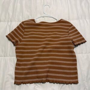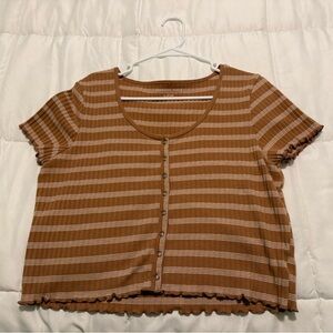 American Eagle Outfitters Brown and Cream Striped Button-Front Crop Tee