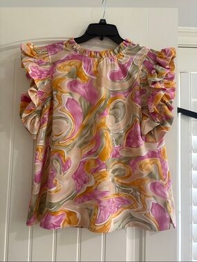 JODIFL Pink, Yellow & Cream Swirl Ruffle Sleeve Blouse