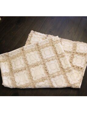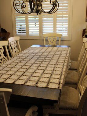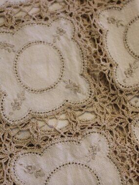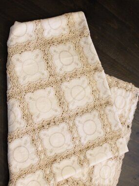 Beautiful Antique/ vintage Handmade Tablecloth. Beautiful cream linen with hand embroidery. Stunning tan hand crochet creates a unique granny square pattern. Rectangular design. Beautiful scalloped edge. Victorian, Edwardian vibe. Pair with your favorite Lilly Pulitzer or Ralph Lauren accents for that special family dinner.
