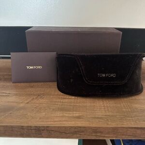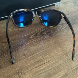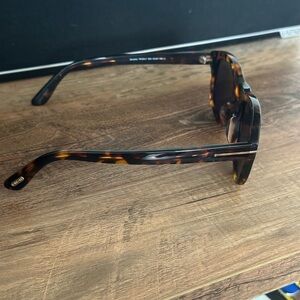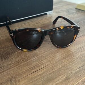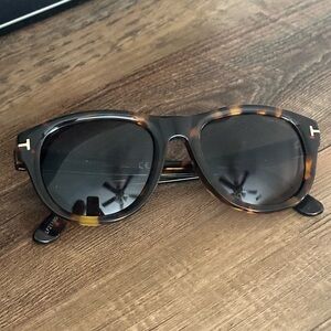 Tom Ford designer sunglasses. Tortoiseshell acetate frame with dark brown polarized lenses. Subtle Tom Ford logo at temples. Fashion-forward round silhouette.