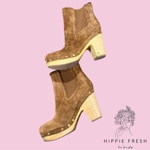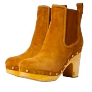 Color: Hazel wood Chelsea boot styled clog booties. Pull-on style with elastic sides. Goldtone stud accents