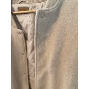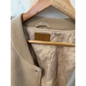Crescent beige wool-blend bomber jacket with snap front closure, ribbed collar/cuffs/hem, side pockets, and quilted lining. Relaxed fit with a clean, minimal silhouette — perfect everyday layering piece for fall and winter. No major flaws noted — great pre-loved condition.