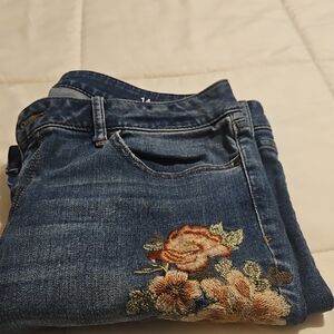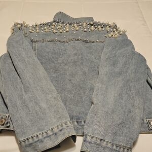 Trendy light blue denim jacket with pearl and stud embellishments on shoulders. Classic button-front design for easy styling. Soft blue denim pairs well with casual or dressy outfits. Elegant pearl detailing adds a feminine touch.