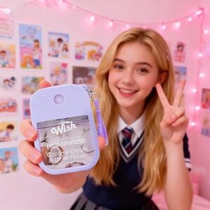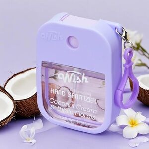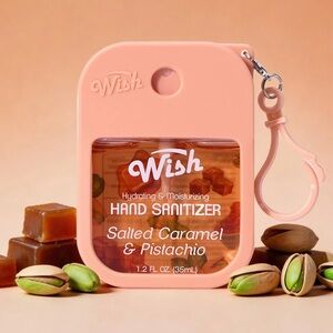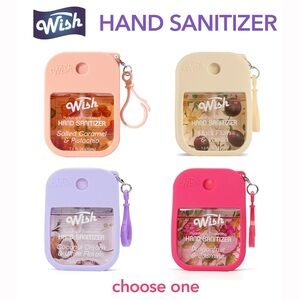 Compact silicone keychain sanitizer set. Transparent window reveals Wish-branded sanitizer. Four bright colors for easy identification. Clips securely to bags or keys. Convenient for daily use.