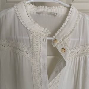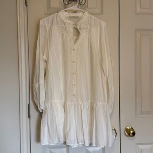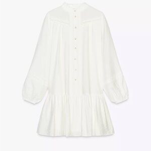 Lightweight white mini dress with a relaxed fit. Button-front closure and subtle smocked detailing. Long puff sleeves with gathered cuffs. Flared hem